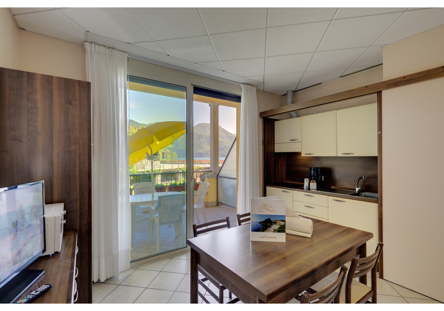 Een appartement van 35 m2 modern en goed ingericht, uitgerust met een slaapkamer met tweepersoonsbed, zitgedeelte met open keuken en een slaapbank voor twee personen, badkamer met douche en bidet, een balkon met gedeeltelijk uitzicht op het meer en uitgerust met tafel en stoelen.